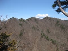 前仙人ヶ岳への道と別れて、白葉峠方面への稜線を辿る。ここからは、2006年5月にも逆コースで歩いた所だ(山行記録)。赤松の多い尾根を下ると、荒倉山の頂上に着く。ここから見る仙人ヶ岳は標高の割に山奥深い感じがして、お気に入りのアングルの一つだ。