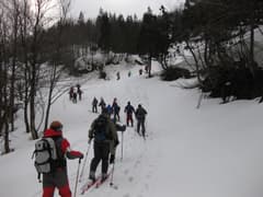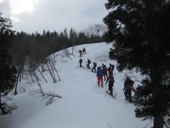 林道終点から急な斜面を登る。シールでの登高に慣れていないと、苦労しそうなところだ。小さな谷を横断し、さらに急坂が続く。息が切れたところで2回目の休憩。