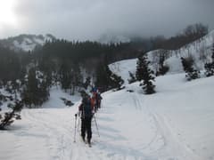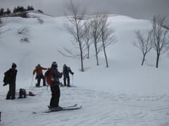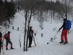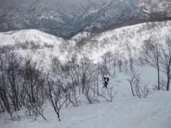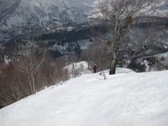 尾根を下がったのち、左の浅い谷に滑り込む。ここは小さな木立があり、ますます雪が重くなって悪戦苦闘。前を行くおじさんテレマーカーは、小さなターンでスピードをうまく制御して滑っている。うーむ、比べると私はまだまだ修行が足りないなぁ(^^;)