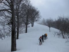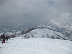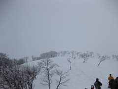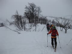 急な斜面をジグザグに登ると、ようやく尾根の上に出た。少しガスが切れて麓が見えたが、その向こうに見えるはずの守門岳は雲に隠れたままだ。ここからはブナが点在する尾根上の緩い登りとなり、シールを効かせて快調に登る。相変わらずガスが掛かっているが、時々見える周囲の山々は真っ白な雪に覆われて、いい眺めだ。尾根の左側はヤジマナ沢に落ちる急斜面で、雪庇が出来ている。左上の尾根に桜ゾネの駐車場が見える辺りで、3回目の休憩となる。