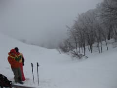 尾根上の緩い登りが続くが、上がるにつれてますますガスが濃くなって来た。標高約1,300mで左側が浅い谷状となっている場所で、雪庇の陰で風を避けて大休止となる。スキー板を外して腰掛けにし、パンを齧ってテルモスの熱いココアで流し込む。スタッフさんが会議を開いていて、その結果ここで撤退することとなった。頂上まであとは一本の尾根で、ルートはばっちり判った。ここで引き返しても私としては全然OKだ(^^)