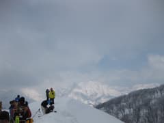 ほぼ往路を滑って、林道終点の広場に着いた。あとは平らな道を滑るだけだ。計1時間程の滑降で、ホテル大自然館にゴールイン。スタッフさんに腕章を返却して、無事帰ったかチェックを受ける。あー、面白かった。このルートはまた来たいですね。感謝。用意されていた豚汁を貰って、奇麗に晴れた青空と雪景色を見ながら、美味しく頂く。