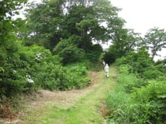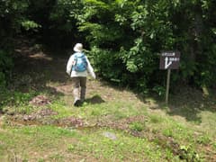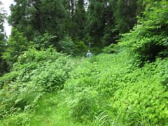 車を置いて山道に入ってみるが、人が歩いた形跡は全く無しで草むらに覆われている。少し進んだところで藪がひどくなり、断念して引き返す。後日、GPS軌跡を確認すると、途中で右に折れてB地点に向かうべき個所を直進してしまったようだ。