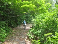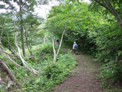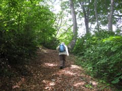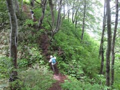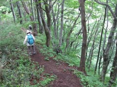 天水山の先もブナ林の尾根歩きが続く。緩く下ると新潟県側(北側)は急斜面となり、登山道はその縁を通って小さな登り降りを繰り返す。急斜面の下には緑に包まれた谷があり、遠くには棚田が広がっている。途中、北側に広く開けた展望ポイントがあり、遠く黒姫山まで見通すことができる。涼しい風が吹き上がって来て、気持ち良い。