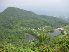 暑くて結構汗をかきつつ、30分弱の登りで頂上に到着する。頂上には「明治二十八年十月二日願人涌井太源二」と刻まれた石祠、石仏、木登り用?に枝からロープが下がり、幹に鉄梯子が立て掛けられたブナの大木がある。樹林に囲まれて展望はないが、展望台という道標に導かれて少し下ると断崖の上に出て、眼下に薬師湖の眺めが良い。