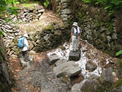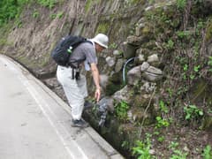 深坂峠からは林道野々海天水越線を辿って、車を置いた松之山口まで戻る。急斜面を横切るように付けられた林道は車の通りも稀で、ずっと新潟側を眺めて歩けるので快適だ。途中、道路脇に湧き水があった。飲んでみると雪解け水のように冷たくて美味しい。ペットボトルに詰めて持って行く。