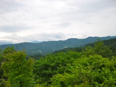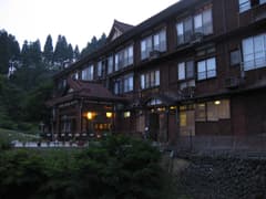 R405を下って松之山温泉の天水越(あまみずこし)地区に出て、今晩の宿の凌雲閣に着いた。凌雲閣は、松之山の温泉街とは山一つ隔てた静かな山村にある。昭和初期に約80℃の高温泉源をボーリングで掘り当てたそうで、当時の木造三階建が残るレトロな宿だ。早速、大浴場へ。泉質は、黄みがかった透明、昔の木の電柱に塗られていた黒い防腐剤のような独特の臭いがして、なめると苦くて塩っぱい。松之山温泉は日本三大薬湯(あとは草津と有馬)だそうだが、なかなかユニークな温泉だ。夕食も山菜中心でとても美味しかった。