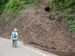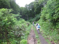 この林道は冬期は通行止めになり、今年は6月19日に開通したばかりだ。雪はほとんど消えているが、途中には木の枝や枯れ葉が覆い被さった残雪があった。標高約1000mの山に6月下旬まで雪が残るのだから、冬期の積雪量は相当のものだろう(尾根上では8mに達するらしい)。