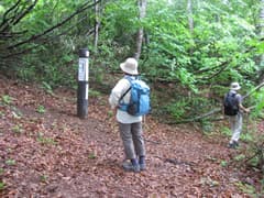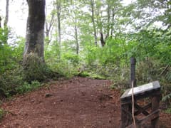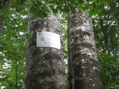 展望台から頂上に戻り、水を飲んで休憩する。頂上の道標によると、登って来た道は表参道、反対側に下る道は裏参道と言うらしい。帰りは裏参道を下る。こちらの道も良く整備されている。すらりと伸びたブナの美林を下って、北側の山麓に降り着いた。