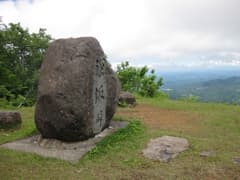 深坂峠には大きな石碑があり、新潟県側には見渡す限り緑に覆われた丘陵地帯が広がって、遠くには米山やGWに登った刈羽黒姫山・八石山、越後三山まで見える。これは他にちょっとない景観かも。