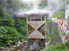 一風呂浴びた後、夕食まで時間があるので、一人で温泉街を探索した。上流にいくと源泉湯やぐらがあり、例の油臭さが漂って、勢い良く湯気が吹き出していた。源泉の説明板によると、火山地帯でもないのに90度以上のお湯が自噴しているそうで、なんでも約1200万年前の化石海水が断層から湧出する「ジオプレッシャー型温泉」だとか。本当かどうかはわからないが、いずれにしても珍しいタイプの温泉には間違いない。