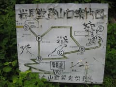 車に戻り、先程間違えた分岐を左に進んで岩見堂岩に再度アプローチする。狭い未舗装林道に何とか車を進めて、案内図のG地点と思われる広い駐車場に着く。ここには標識の残骸?があり、歩いて10分とだけ読める。ついに雨が降り始めたので、傘を差して岩見堂岩を目指してみた。しかし、山道に入るとまたしても藪っぽいので断念。うーむ、非常に気になるが、またの機会ということで。