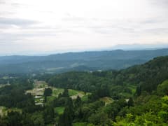 今日は天気が悪いので遠方はもやがかかっているが、眼下には松之山兎口の山村風景、遠くには越後三山のシルエットが見えて、展望はなかなか良い。