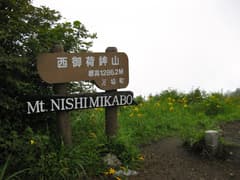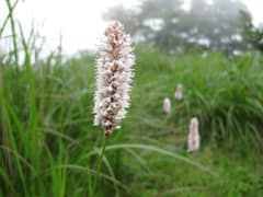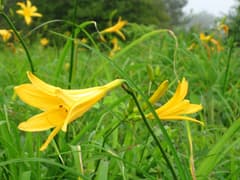 頂上に到着すると、こちらのニッコウキスゲも見頃だ。花が目当てのハイカーさんが大勢訪れていて、三脚に載せた大きなカメラを構える方もいる。天気が悪くて展望はないが、霧を背景に風に揺れる花も風情があって良い。しかし、長井屋のまんじゅうはさっぱりした甘さでやはり美味いなあ。ぱくぱくと何個も食べてしまった(^^;)