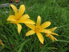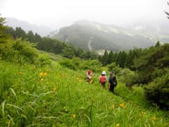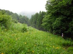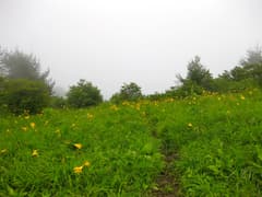 登山道に入って薄暗い植林帯の中の急坂を暫く登ると、草原の斜面に出て、ニッコウキスゲの黄色い花がたくさん咲いている。