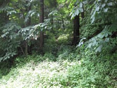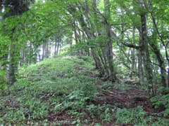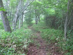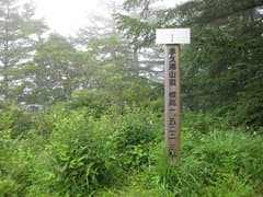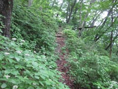 頂上から東コースや南尾根コースの様子をうかがうと、夏草に覆われていて、この季節に歩くのは大変そう。北コースは深い樹林帯中の道なので、草藪はそれほどでもない。ご夫婦が登って来るかなと思ったが、どうもいらっしゃらないようだ(やはり、クマを警戒して登らなかったそうです)。来た道を車に戻る。
