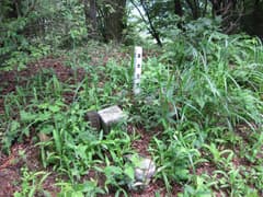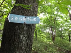 平らに近い緩い登りの尾根を辿る。途中、掠れた文字で「←ミカボ山 塩沢峠→」と書かれたかつてのハイキングコースの道標を見た。道標の指し示す方向の道は稜線の北を巻いているが、そちらは藪が深い。稜線上には朽ちた木の階段が続いていて、こちらはスーパー林道開通後に整備された道らしい。後者を辿るが、こちらもようやく跡が残っているという程度の道だ。