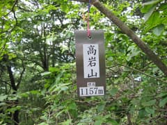 急坂を登りきると、三等三角点のある高岩山の頂上に着いた。樹林に覆われて展望は全くない。地味な山頂で、一つピークを踏んだという満足だけがある。しかし、こんな山にも登る奇特な人はやはりいるようで、金属プレートにビニルテープを張って作製した山名標が、頂上の木の梢にぶら下がっていた。金属にまだピカピカの光沢があるところを見ると、最近付けられた物らしい。