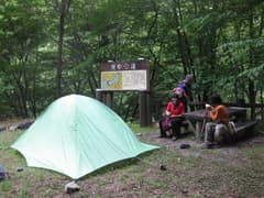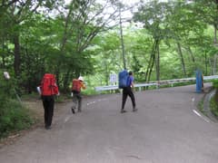 一の鳥居までの下りは楽だ。テントを撤収し、林道を歩いて銀山平の駐車場に戻った。