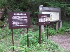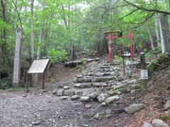 濃い緑に覆われた庚申川の渓谷を見ながら林道を歩き、1時間ちょっとで一の鳥居に着く。ここに以前建っていた東屋は倒壊していた。いつ倒れたのかな。