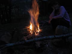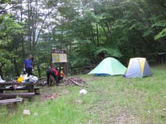 一の鳥居を潜らず、庚申七滝の方へ行く。七滝遊歩道の入口は広場となっていて、テントを張るのにぴったし。すぐ近くを七滝の沢が流れているので、水も便利。ベンチもある。早速、沢でビールを冷やして、テントを設営し、枯れ木を拾い集めて焚き火を熾す。枯れ木は細いのも太いのもパリパリに乾いていて、あっという間に盛大に燃え上がった。