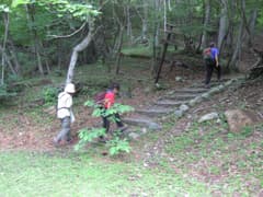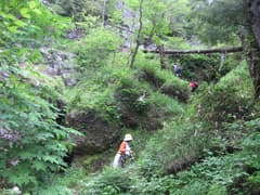 今日は庚申七滝の近くでテントを張って、焚き火を囲んで宴会をしようという予定なので、テント泊の準備と食料、酒やつまみでみんなのザックは大きい。他のハイカーさんが見たら、庚申山に何しに来たんだと怪しむこと必至(^^;)。しかし、コウシンソウの時期は過ぎ、時間も遅いので他のハイカーさんは見かけない。