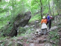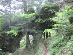 岩壁の基部をトラバースして行くと、お山巡りのシンボル、めがね岩に着く。板状の大岩に半円形の大穴が綺麗にあいている奇観だ。このあとも岩場の険しい道が続く。