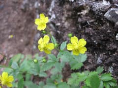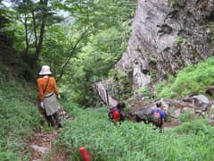 岩場に突き当たって左にトラバースすると、いよいよお山巡りの核心部が始まる。登ったと思ったら、ツル岩・カメ岩の基部から草の生えた急な斜面を下り、桟道を渡る。見上げると覆い被さるように岩壁が峙つ。岩壁には黄色い花が点々と咲いているが、何の花だろう(後日、Mさんにイワキンバイと教わる)。