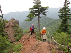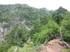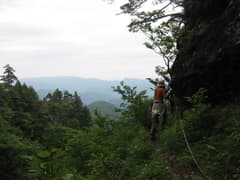 岩壁の下をトラバースする道は、ところどころの桟道が傾いていたりするので通行注意。鎖場や梯子も現れる。やがて、赤茶けた痩せ尾根となった「馬の背」に出て眺めが開ける。振り返ると、庚申山の岩壁と樹木の組み合わせが南画山水のようだ。ここは紅葉の時期もいいだろうなあ。