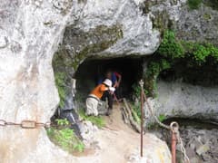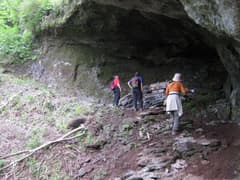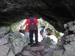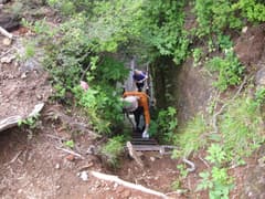 ようやく庚申山への分岐に到着。このすぐ上に「大胎内」という屈んで通り抜けられる岩穴があり、入ってみた。Mさんの話によると、以前は「大胎内」を通って1周できたとのこと。今は鉄梯子の上が岩で塞がっていて、周回はできないので引き返す。