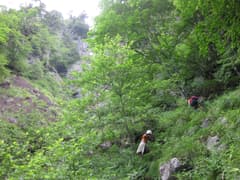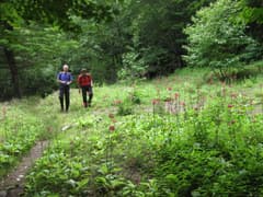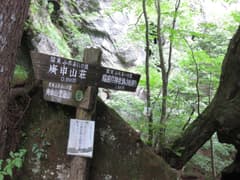 お山巡り分岐を過ぎても、一ノ門、梵天岩、女体岩戸、裏見の滝などの岩場の見所が続く。一部、道が崩れている所もあって、意外と気が抜けない。クリンソウの咲く平地に出れば難所は終わりで、ホッと一安心。