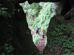 馬の背から「鬼のひげすり」と呼ばれる岩の裂け目を梯子で下る。