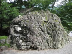 駒形登山口に向かう途中で、気になるスポットの一つの白滝神社に立ち寄る。白滝神社は、桐生に養蚕・製糸・機織りの技術を伝えたという白滝姫を祀っている。山の端に巨木を背にして本殿が建ち、なかなか神さびた雰囲気。境内の一角を降臨石が占めていて、目を引く。高さ3mくらいの、ちょっと登りたくなるような巨石だが、注連縄が張られていることが示すように、登攀禁止(^^;)。また、神楽殿もあり、説明板によると、毎年8月の例祭には太々神楽が奉納されるとのこと。