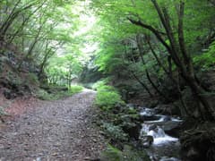 寄り道から戻って、鳴神山の駒形登山口へ向かう。低山歩きには暑過ぎるこの時期でも、登山口には6、7台の車があった。少し戻った路側に車を置き、歩き始める。駒形コースを右に見送って、左の林道赤柴線に入る。それにしても、今日は最高に湿度が高い。林道の脇を水量の多い川が流れていて、近づくとヒンヤリとした風が巻き起こっていて涼めるのだが、少し離れるとその効き目もなくて、汗だくだく。ちょっと気分が悪い。
