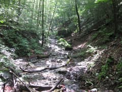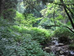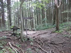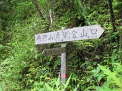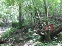 沢沿いの山道を緩く登ると、やがて浅い沢の中を歩くようになる。周囲は自然林で、なかなか好ましい雰囲気だ。やがて、半壊した「…登山道」という道標があり、ここから山腹を登る。急坂にさしかかって、また一気に汗が噴き出す。