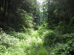 「鳴神山(赤柴)登山口0.4km」の道標に従って、右に進む。林道を覆い尽くして夏草が繁茂し、露で登山靴が濡れる。7分程で林道は終点となり、小広い平地がある。草藪に隠れて道標の類いは見あたらないが、ここが赤柴登山口のようだ。