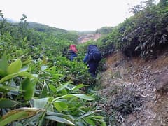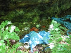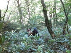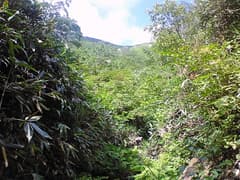 さらに猟師ノ沢を遡ると左岸の岩壁に窪みがあり、中にブルーシートや食器が散乱していた。ここが猟師ノ岩洞らしい。このすぐ上流から左岸の斜面を急登する。踏み跡は不明瞭だが、やがてロープが現れ、これを伝って猟師ノ沢と本流を分ける小尾根の上に出た。