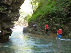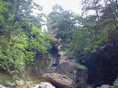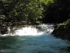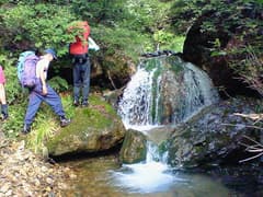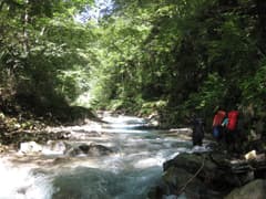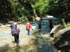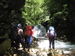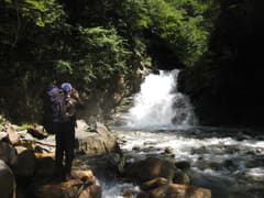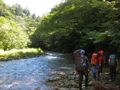 最近、雨が降り続いたためか川の水量は多く、膝くらいまでの徒渉を繰り返す。特に水量の多いところはスクラムで渡る。やがて、両岸が岩壁となって狭まった銀淵という地点に着く。ここをへつりで通過すると谷が開けて、遠く上ノ間山辺り?の稜線が見える。青空が広がって開放的だ。少し緊張が解けて河原を歩く。再び両岸が狭まり、小滝を越える。青く澄み切った水が綺麗だ。