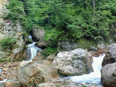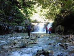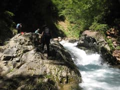 やがて、猟師ノ沢出合に着く。本流は暴れるような水勢の竜ノ口滝で、右から合流している。出発から3時間が経過。徒渉で時間をくったが、ここまでの行程は順調だ。休憩して、ゆっくり昼食を摂る。