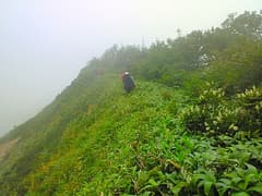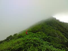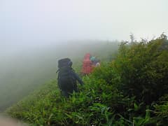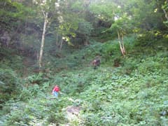 水のない小さな窪を、上から覆い被さる笹藪を搔き分けて登って行く。やがて笹が低くなって源頭の雰囲気になり、最後は急斜面を登って、上ノ間山北側の国境稜線に這い上がった。皆、しばらくぐったりと休憩。稜線にはガスが流れ、陽射しを遮って涼しいのが嬉しい。