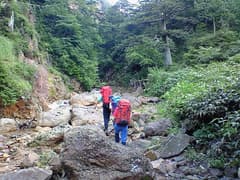 尾根に出たのは良いが、本流側の斜面は崖に近く、踏み跡は見当たらない。MさんとHさんが偵察してルートを検討した結果、ロープを出して斜面を真っすぐ下ることになった。立ち木を支点にして数ピッチ下ると傾斜が弱まり、最後はガレを下って本流に降り立った。ここも、ここしか川に降りれないというピンポイントのルートだった。猟師ノ沢出合からこの大高巻きの終了まで、予定の2倍の2時間が経過していた。念のため装備に入れていたロープが役に立った。沢登りでは何が起こるか判らない。