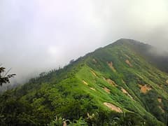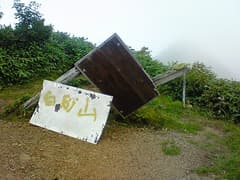 2078m峰(猟師ノ尾根ノ頭)の東の平坦なピークで、腰を下ろして一休み。このあたりは尾根が広いので、ガスに巻かれると迷いそう。笹に覆われた稜線をユルユルと登ると、行く手のピークに見覚えのある壊れた案内板があるのが見えた。やったー、あれが白砂山だ。最後の笹藪を搔き分けて、ハイカーさんが休憩中の頂上に飛び出した。やれやれ、お疲れ様ー。メンバー一同、体力は限界に近く、余裕のない状態だった。藪漕ぎ中、ガスで涼しかったのは運が良かった。陽射しがあったら、途中で水が尽きたかも知れない。