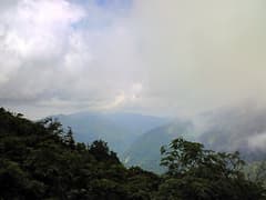 一旦、鞍部に下って、急坂を登り返す。笹を踏むと滑るので、笹を摑んで腕力で登る。笹藪漕ぎはこれがきつい。小ピークに登り着いたところで一息入れて振り返ると、上ノ間山がきれいな三角形の山容を見せていた。北には清津川の深い谷を隔てて、苗場山の平たい頂上が遠く眺められる。どちらを見ても山また山、谷また谷だ。