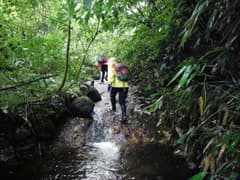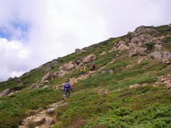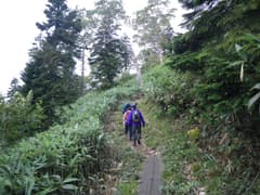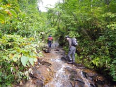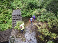 しかし、気持ち良いナメが続く核心部は、半時間程で終了。二股から右の沢に入ると、水流は細って傾斜が増す。最後は沢登りのいつものパターンで、灌木と笹が被さる窪を登って笹藪に突入。これを強引に突破し、登山道の木道に突然飛び出た。