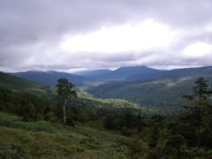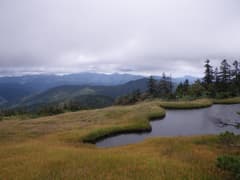 渓流タビをトレラン用シューズに履き替えて、登山道を歩く。こんな天気でも行き合うハイカーさんは多い。尾瀬ヶ原を見おろすと、既に草紅葉が始まっている。燧ヶ岳の頂上は残念ながら雲の中だ。オヤマ沢田代〜笠ヶ岳間の道を歩くのは、私は初めて。途中の悪沢岳は道の途中のピークらしくない場所なので通過する。背の低いオオシラビソや笹原の中を緩く登降する道が続く。数は少なくなるが、笠ヶ岳を往復して来たハイカーさんとしばしば行き合う。