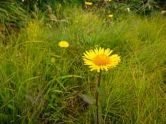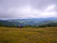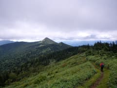 やがて開けた草原に出ると、目の前に笠ヶ岳の三角形のピークが颯爽と現れる。時折、頂上を雲の底が擦って行くが、頂上からの展望は期待できそうだ。