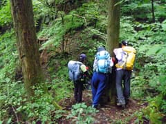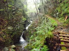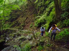 準備を整えて出発。沢沿いの道を歩くと、小さな滝が続き、ワサビ田が現れる。約20分程歩くとこのコースのハイライトのゴルジュ(五段の滝)が現れる。今日は水量が多くて、なかなか迫力がある。木の桟道、岩壁に穿たれたトラバース道で通過する。