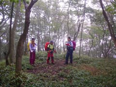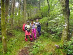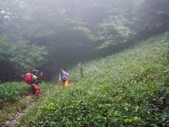 小坂の滝、水源宮の石碑を過ぎ、渓谷を眺めながら歩く。この辺り、もう少し経つと紅葉が綺麗だろうな。ワサビ田が続くあたりで、とうとう雨が落ちて来たので、雨具を着ける。進むか引き返すかちょっと迷うが、登るっきゃないというYさんの力強い一言で前進、前進〜。沢を離れて山腹を登る頃には雨も弱まり、急坂で汗をかいたので雨具を脱ぐ。余裕も出て、途中の開けた笹原の斜面ではポーズを付けて、ハイ、チーズ(^^)