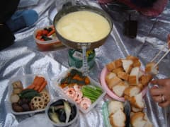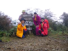 頂上には他に誰も居ないので、シートを気兼ねなく広げてその上で昼食にする。チーズをフライパンに投入し、ワインと水を加えて、煮るべし、煮るべし。チーズが溶けたところで、フランスパンその他の具材を絡めて食べる。うま〜い♪その他にも美味しいものが次から次へと登場。ちょっと霧雨が降っても、食べている間は全く忘れる程、食べまくる。ご馳走を頂いたのち、みんな満足の笑顔で記念写真を撮る。