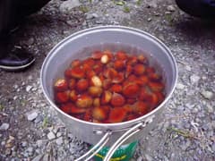 小戸川に降り着き、渓谷沿いの道を下って登山口に戻った。山栗は現地で茹でて食べるのが美味しいよ、とのことで、コンロとコッヘルを取り出して早速茹でる。茹でたての栗は鬼皮が爪で楽に剝けるし、渋皮も柔らかくて口に入っても気にならない。熱々ホクホクで甘みのある栗を食べ出すと止まらなくなり、みなで全部食べてしまった。